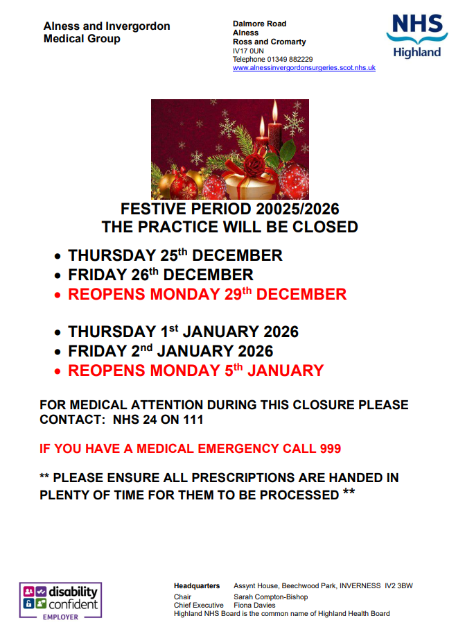 Alness and Invergordon Medical Group is an NHS GP Practice that provides general medical healthcare services to a population of 13,500.