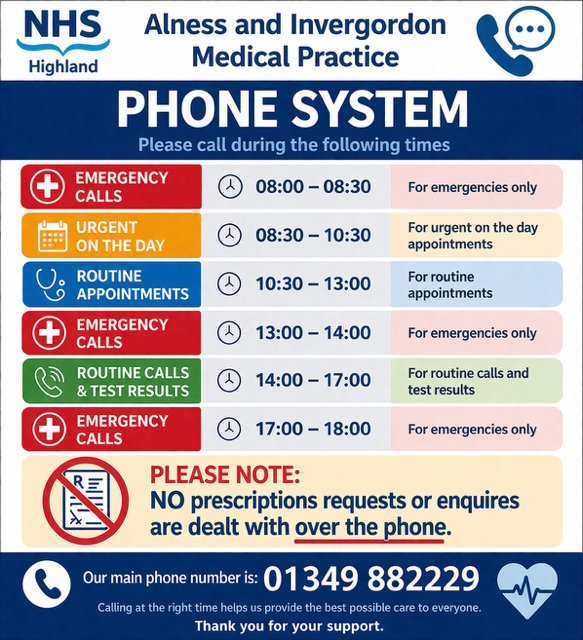 Every effort will be made to see patients with urgent medical matters during surgery hours. Please phone 01349 882229 and a care navigator will take your details and pass them on to the on call doctor.