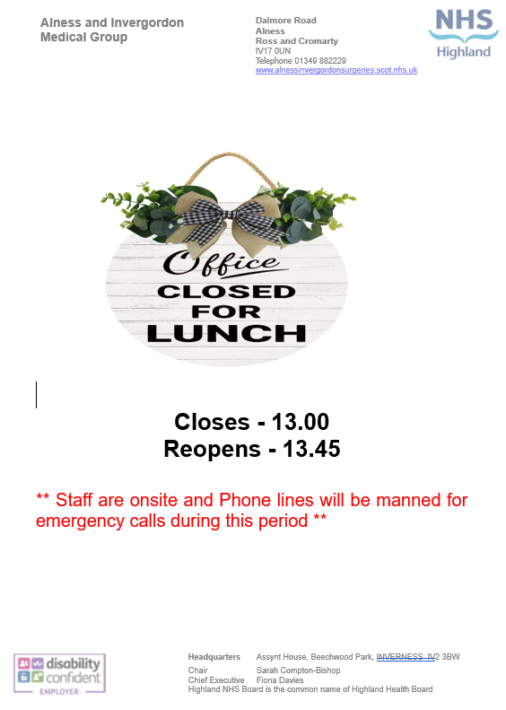 To make an appointment to see a doctor please phone 01349 882229 during opening hours. Please note phone line opens 08.30am